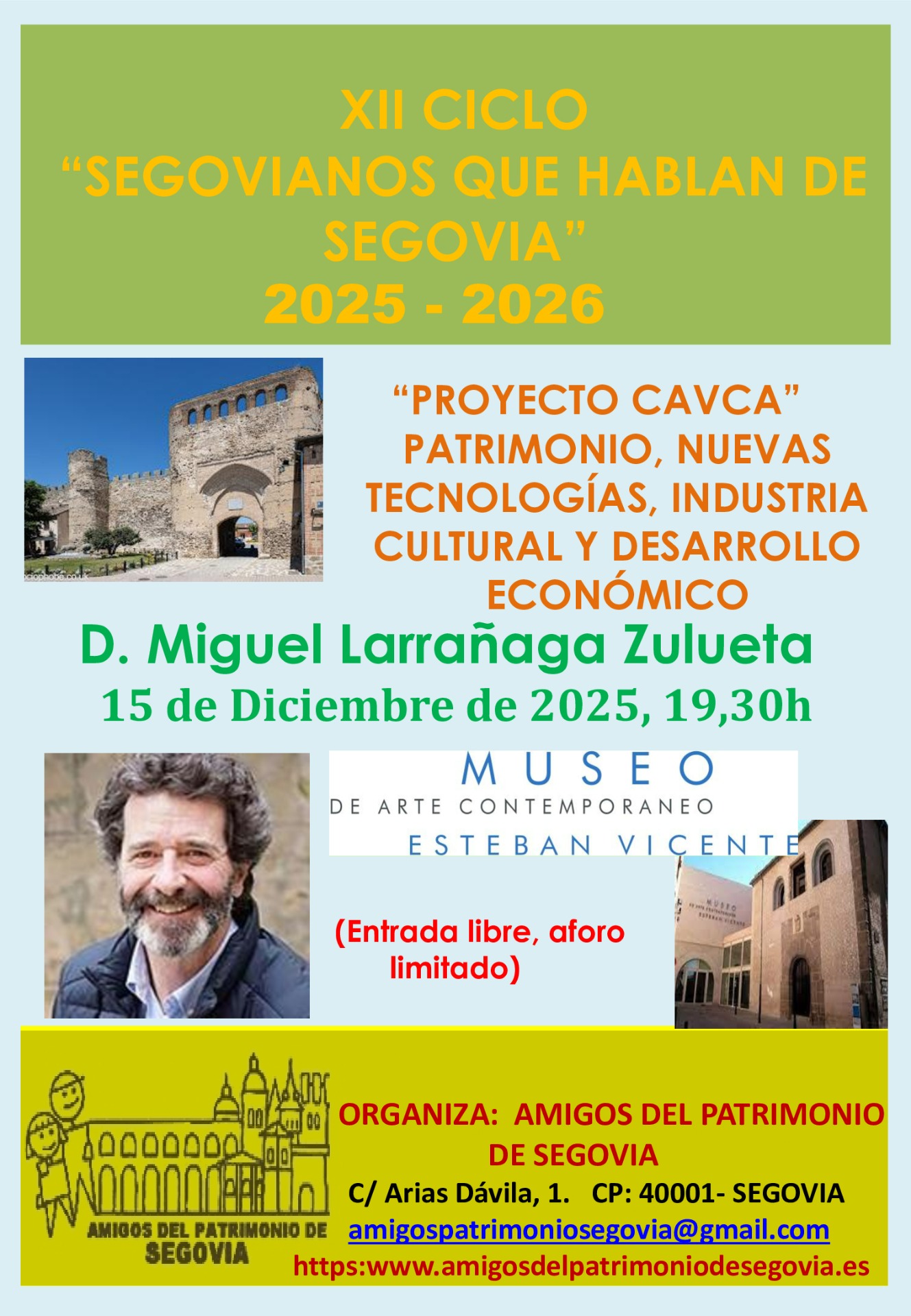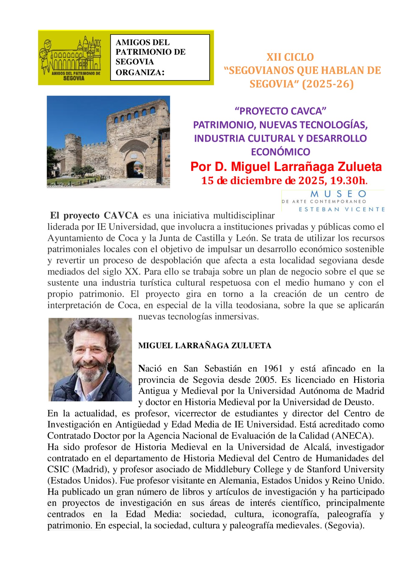 Desde Amigos del Patrimonio de Segovia, empeñados en promover la defensa, el conocimiento y la estima de nuestro rico Patrimonio cultural, nos satisface poder comunicaros el inicio de un nuevo ciclo de lo que venimos denominando "Segovianos que hablan de Segovia". Será el décimo ciclo de una serie que comenzó con ilusión pero sin pretensiones de perdurabilidad en el tiempo. Son los resultados de los ciclos anteriores los que nos animan a continuar un año más con los mismos objetivos de cursos anteriores: hacer llegar a los segovianos, el trabajo y la dedicación de otros segovianos, estudiosos de diversa facetas de esa "herencia cultural" que nos da cohesión e identidad y que entendemos con el nombre genérico de Patrimonio cultural.