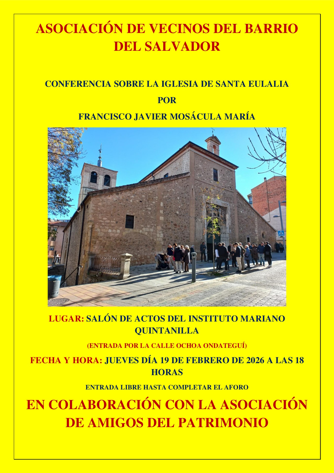 Conferencia sobre iglesia de Santa Eulalia, el jueves 19 a las 18:00 en el IES Mariano Quintanilla a cargo de D. Javier Mosácula, ya conocido por todos y socio nuestro. Se hace en colaboración con la Asociación de Vecinos de El Salvador. Como complemento a esta actividad el sábado día 28 de febrero se visitará dicha iglesia, a las 11,30h.